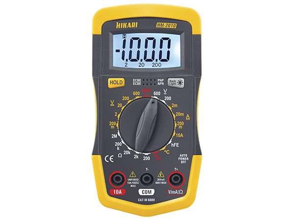 Instrumento digital portátil, com visor LCD de 3 ½ dígitos com iluminação de fundo, de acordo com a categoria III de segurança 600V , holster protetor, congelamento de leitura, desligamento automático e mudança de faixa manual. Realiza medidas de tensão DC e AC, corrente DC, resistência, temperatura, hFE , diodo e continuidade.