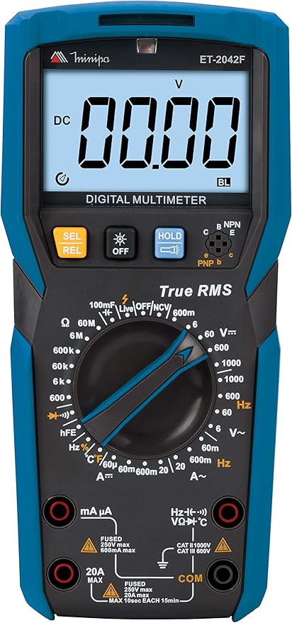 O multímetro digital modelo ET-2042F possui display de 6000 contagens com iluminação de fundo (backlight), capacidade de realizar medidas de tensão AC/DC, corrente AC/DC, resistência, capacitância, frequência da rede, frequência e duty cycle, testes de diodo, continuidade, temperatura, hFE de transistor e teste de diodo. Como características adicionais apresenta as funções True RMS, Auto Power Off, indicador de bateria fraca e função de detecção de tensão sem contato (NCV), além da função LIVE que permite a detecção de tensão com contato usando uma única ponta de prova.