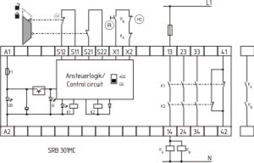 Rele de Segurança SRB301MC, adequado para a avaliação dos sinais das saídas dos interruptores magnéticos de segurança, cortinas ou grades de luz, botões de emergência, fins de curso... Com 3 contatos de segurança, CAT4.
