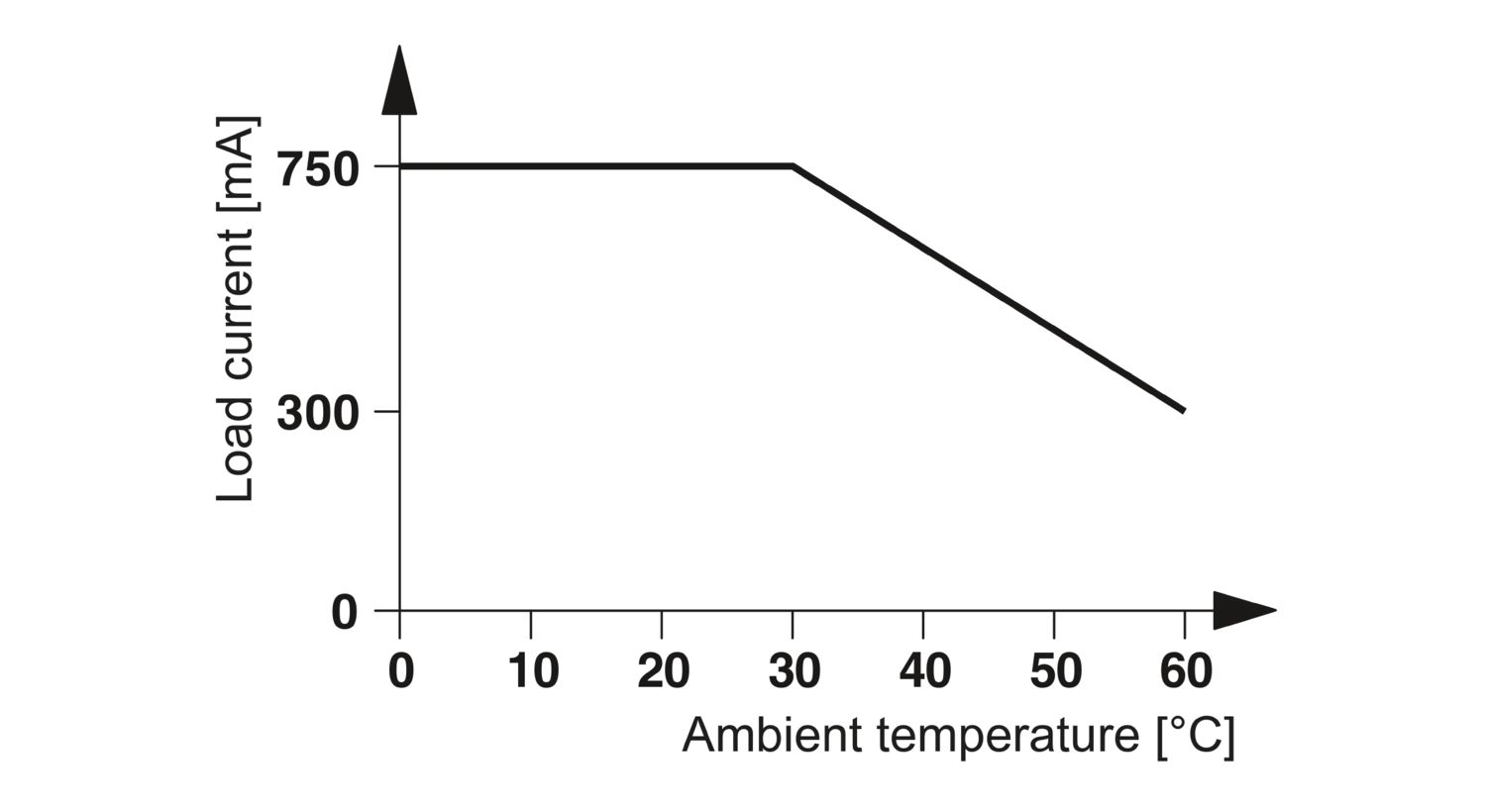 - Corrente limite permanente 0,75 A (vide curva derating)