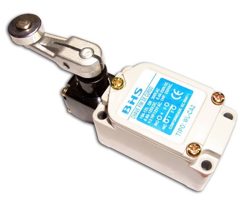 Chave fim de curso com alavanca com roldana em aço e 2 sentidos laterais.