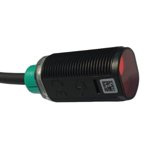Sensor de modo difuso, design de caixa roscada M18, caixa de plástico, face óptica frontal, faixa de detecção de 450 mm, luz vermelha, luz/escuro acesa, versão DC, 2 saídas PNP, cabo fixo.